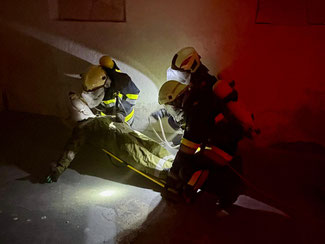 Bei vollkommener Nullsicht musste der Atemschutztrupp die Räumlichkeiten systematisch absuchen und die gefundene Person anschließend mit einem Spineboard aus dem Keller bergen.