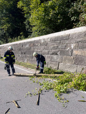 Der umgestürzte Baum wurde mittels Motorkettensäge in transportfähige Teile zerlegt und vom Fahrbahnrand entfernt.